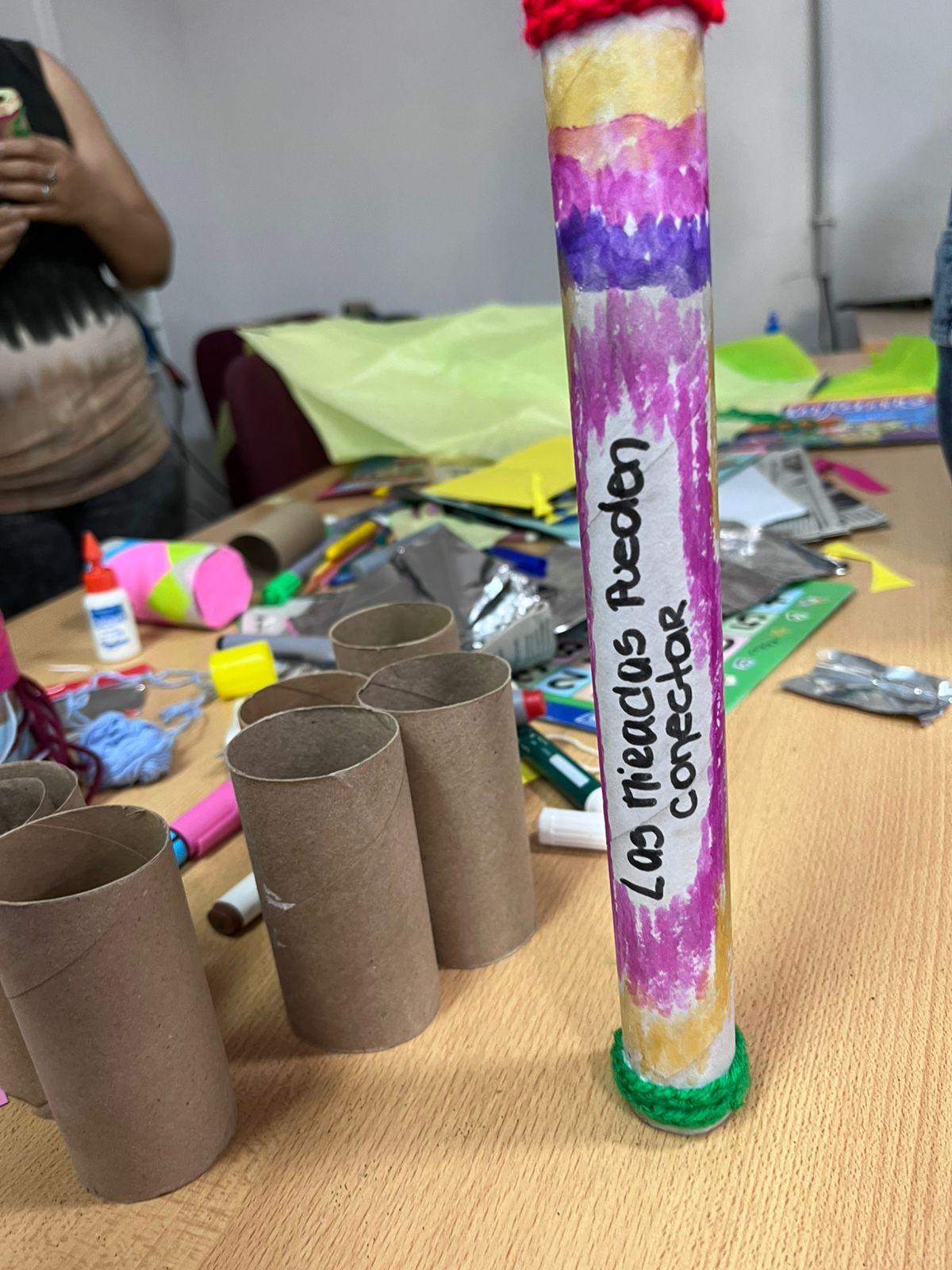 La actividad cerró con una intervención lúdica coordinada por Agustina Guzmán, Juana Sosa y Agustina Rodríguez, egresada y estudiantes de Ciencias de la Educación e integrantes del Proyecto de Extensión, en la que se construyeron caleidoscopios con material reciclado.