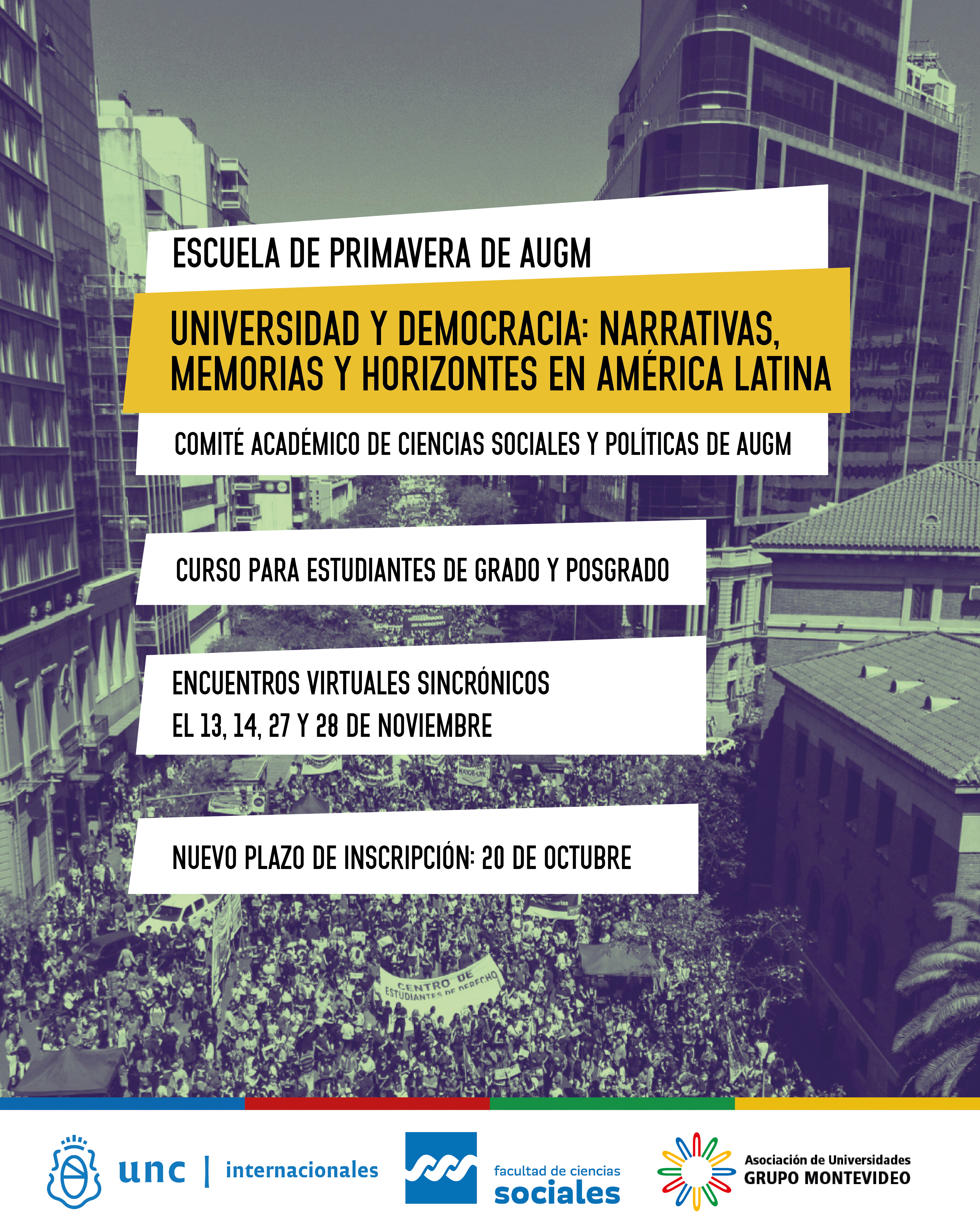 La Escuela de primavera es coorganizada por la Asociación de Universidades del Grupo Montevideo (AUGM) y las Prosecretaría de Relaciones Internacionales de la Universidad Nacional de Córdoba y de la Facultad de Ciencias Sociales y coordinada por Magdalena Doyle y Natalia Becerra, docentes de esta Facultad, representante de la UNC ante el Comité Académico de Ciencias Políticas y Sociales de la AUGM.