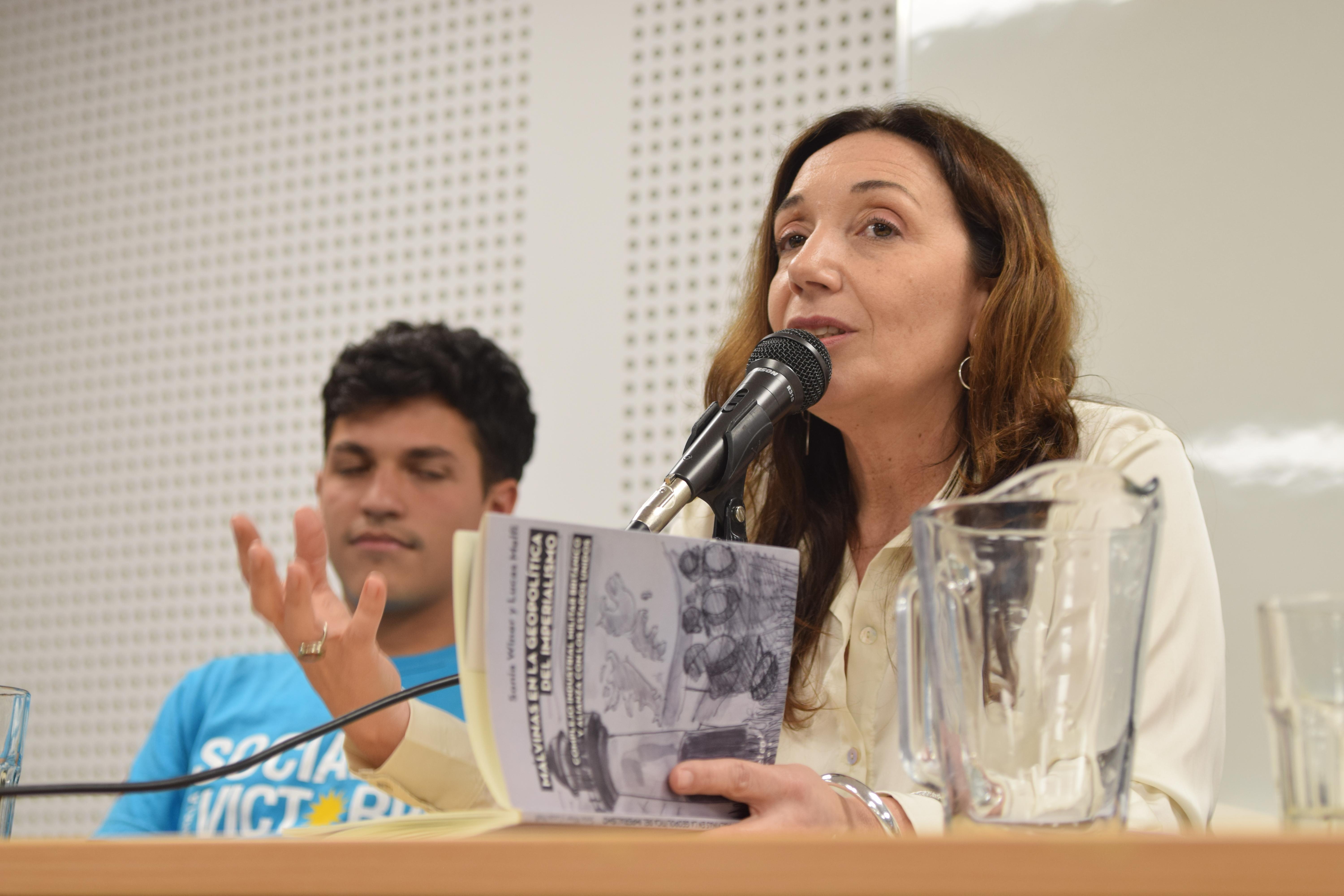Posteriormente, la autora Sonia Winer expuso los puntos principales del libro, con una semblanza de la investigación, desde sus inicios hasta la actualidad, como así también el contexto en nuestros días de la causa de Malvinas, destacando especialmente la importancia de geógrafas mujeres que han estudiado la problemática y porqué es importante tener en cuenta los lineamientos de la geopolítica de las grandes potencias, especialmente Inglaterra, respecto de las islas del Atlántico Sur, para finalmente proponer un ejercicio de reflexión acerca de tener siempre presente las banderas de memoria, verdad, justicia y, especialmente, soberanía y paz.