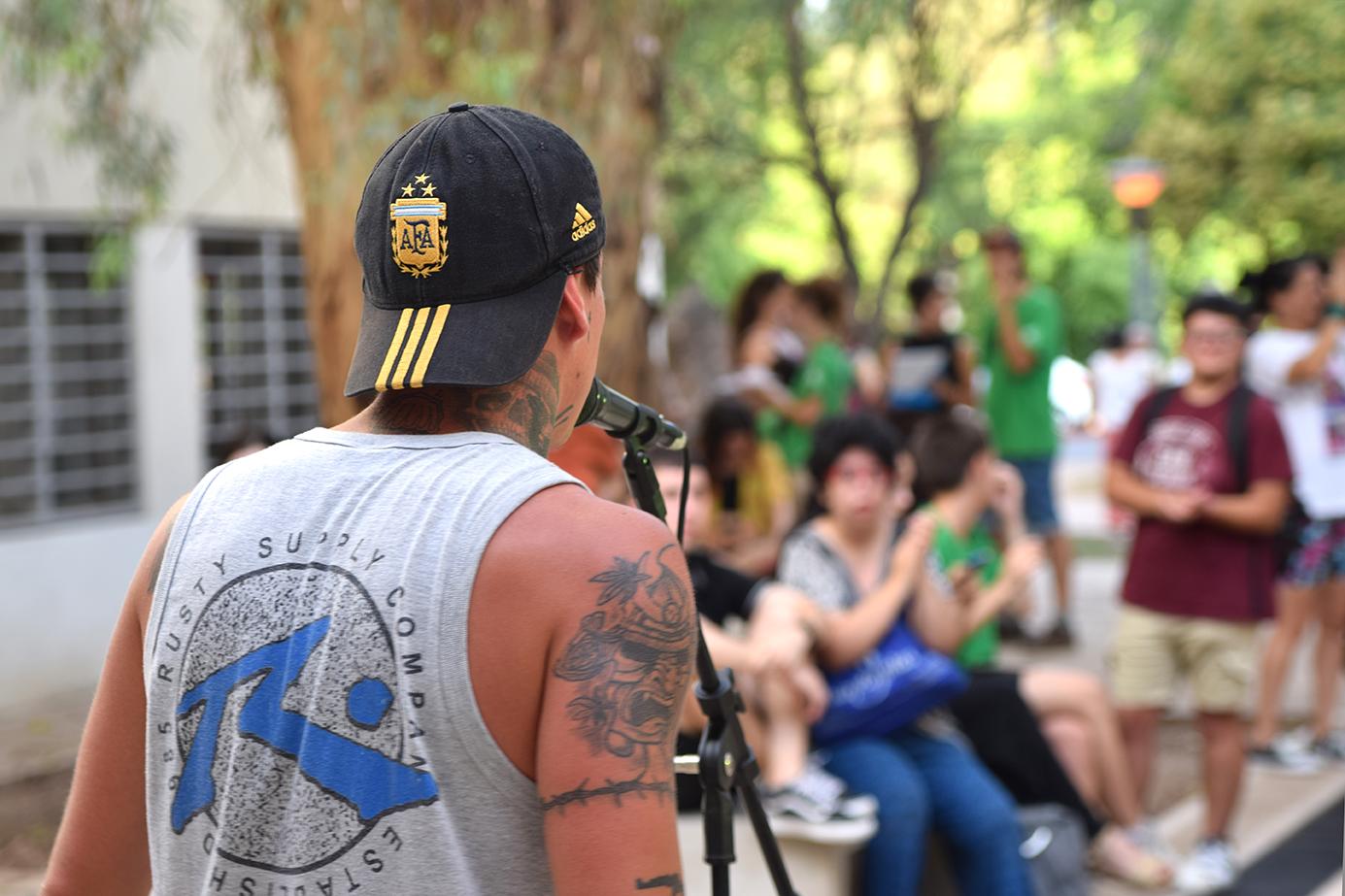 El acto tuvo un alegre brindis final con los presentes y un cierre artístico con la participación de Nico Díaz (ex Rimando Entreversos) que compartió su música en la explanada de la Facultad.