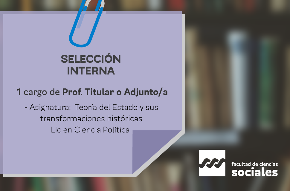 La Facultad de Ciencias Sociales de la UNC llama a selección interna para cubrir como carga anexa a sus cargos de la UNC (1) cargo de Profesor/a Titular o Adjunto a cargo en la asignatura Teoría del Estado y sus transformaciones históricas de la carrera de Lic en Ciencia Política.