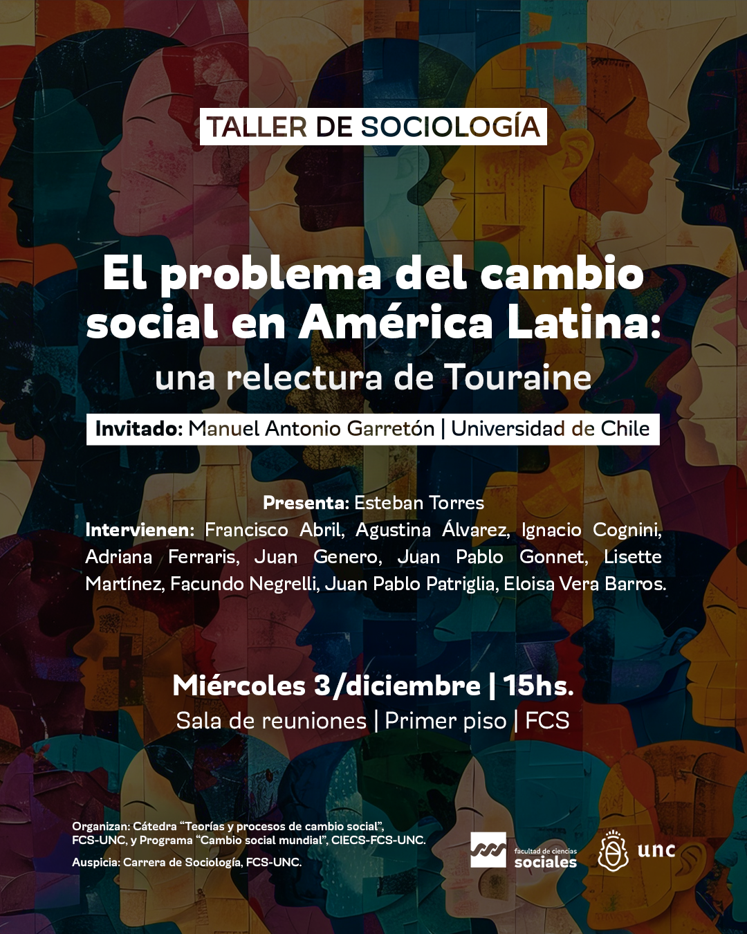 La Cátedra “Teorías y procesos de cambio social” (FCS-UNC) y el Programa “Cambio social mundial” (CIECS-FCS-UNC) organizan el Taller de Sociología “El problema del cambio social en América Latina: una relectura de Touraine”, que se realizará el miércoles 3 de diciembre, a las 15 horas, en la Sala de reuniones (Planta Alta de la Facultad de Ciencias Sociales). En el mismo participará como invitado Manuel Antonio Garretón (de la Universidad de Chile), quien será presentado por el investigador Esteban Torres (CIECS-FCS-UNC)