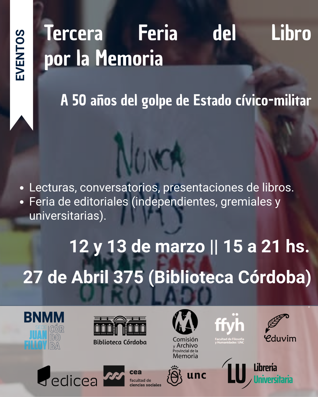 Organizan: Biblioteca Córdoba, Sede Juan Filloy de la Biblioteca Nacional, Eduvim, Archivo Provincial de la Memoria, Facultad de Filosofía y Humanidades-UNC, CEA-UNC, Edicea-FCS-UNC, Librería Universitaria.